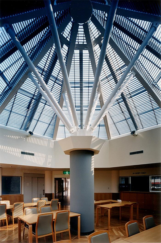 旧来の精神病院のイメージを払拭し、癒しの場にふさわしい、働きやすい病院をつくることを念頭に、「明るい・広い・美しい・清潔・安全・開放的」で鉄格子のない病棟づくりをめざしたもの。昭和56年に第1期の病棟改築が行われ、平成9年に第2期の病棟・事務棟の改築が行われた。新病棟は3階建て、計175床。既存病棟との関連や敷地の形状から、食堂・ナースステーションを軸に病室群が扇型に展開するプランとなった。2つの中庭が明るく開放的な雰囲気づくりに寄与している。