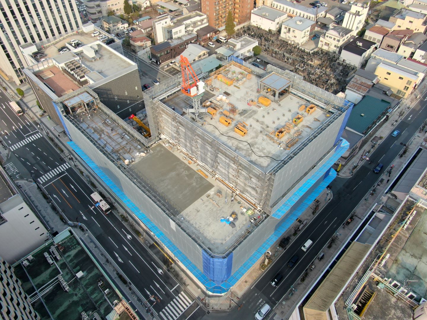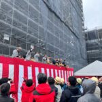 令和7年3月17日に「七日町第8ブロック南地区暮らし・にぎわい再生事業施設建築物新築工事」の上棟式が行われました 令和6年12月から建方を開始した約2,300ピースにものぼる本館棟鉄骨建方が完了いたしました。 上棟式では、各社代表者が鉄骨に金鋲・銀鋲を取り付ける「鉸鋲の儀」「鉄骨名入れ」その他儀式を執り行ったほか、近隣住民の皆様にもご参加いただき、餅まきを開催いたしました。 令和8年2月末に完成予定です。引き続き、監理業務に取り組んでまいります。