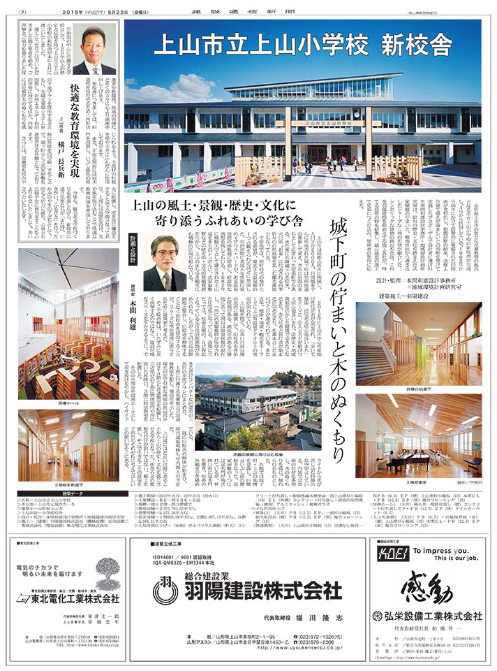 3月に竣工し,4月より供用開始した上山市立上山小学校が,建設通信新聞 (5月22日) の企画頁で紹介されました。